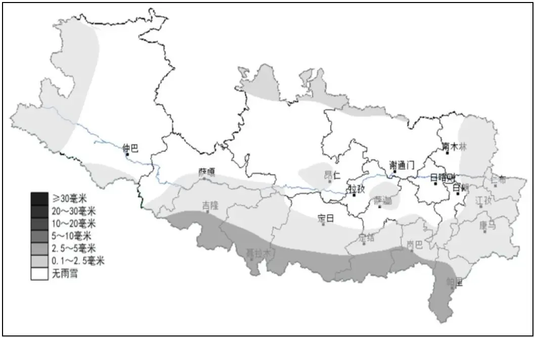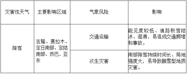 吉隆、聂拉木、定日南部、定结南部、岗巴、亚东部分地方有雨雪灾害中风险,对道路交通安全有不利影响。